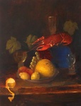 2007Nieuwe kreeft compositie, nu de hoogte in betreft formaat. Aan de onderkant van het schilderij zie je nog de acryl lagen zitten ( tafel en citroen) De bedoeling is dat je bij sommige objecten de acryllaag blijft zien ondanks dat er verschillende lagen olie over gaan. Zo krijg je een mooie verfstructuur waar diepte in zit. Dit werk zal in verschillende fases te zien zijn.